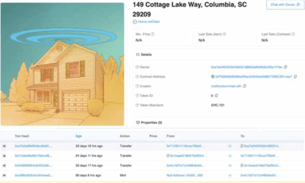 In October 2022, a 3-bedroom house in Columbia, South Carolina was sold for USD 175,000 as an NFT (non-fungible token). The buyer Adam Spipakoff received an NFT to his Ethereum address to prove ownership of the property. A property listing and transaction history on Roofstock onChain is transparent and looks like this